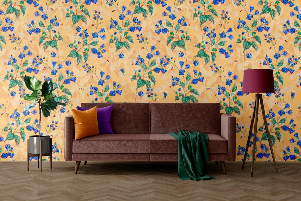 Зображення синіх квітів, намальованих руками у змішаній техніці, на пастельно-оранжевому фоні.